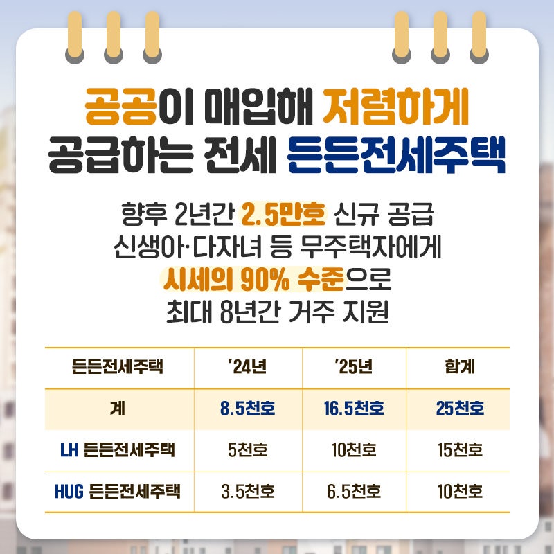 같은 전세주택은 최근 전세사기 문제를 해결하기 위해 설계된 공공임대주택이다. 많은 사람들이 전세사기로 인해 큰 경제적 피해를 입었고, 이를 방지하기 위해 정부에서는 믿을 수 있는 전세주택을 공급하고 있습니다. 안전한 임대주택은 주변 시세의 약 90% 수준의 임대보증금으로 저렴하게 장기간 거주할 수 있는 기회를 제공합니다. 국토부는 2024년부터 2년간 2만5000가구를 공급할 계획이며, 한국토지주택공사(LH)와 주택도시보증공사(HUG)가 지역 내 타운하우스, 다세대주택, 오피스텔을 매입할 예정이다. 수도권 지역에서는 최대 8년 동안 제공됩니다. 우리는 이를 제공할 수 있는 시스템을 구축했습니다. 안전한 임대주택의 가장 큰 장점 중 하나는 이사 나갈 때 보증금을 받을 수 있다는 점이다. HUG가 집주인이기 때문에 보증금 돌려받기에 대한 걱정을 덜 수 있습니다. 저렴한 시세로 최대 8년까지 수도권에 거주할 수 있으며, 입주 시 연령이나 소득 심사가 없다는 점이 큰 장점이다.